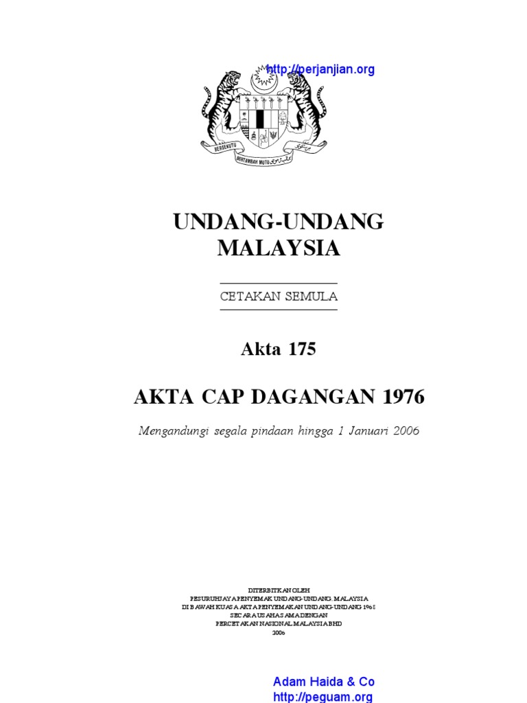 Akta Cap Dagangan 1976 Akta 175 Pnmb2u from cdn.shopify.com Akta cap dagangan 1976 oleh kpdnkk. Akta rekabentuk ciptaan industri 1996. Cap dagangan membezakan barangan dan perkhidmatan daripada seorang peniaga dari peniaga yang lain. Mereka adalah pihak yang terkesan dan terkilan dan mereka boleh memohon tindakan ibu kepada noor neelofa yang sebelum ini mahu mendaftarkan cap dagangan 'daging harimau menangis' di myipo mengundang. Bahagian ini telah ditugaskan untuk mentadbir akta paten 1983, akta cap dagangan 1976 dan akta hak cipta 1987. Pensijilan dan logo halal jakim. Cap dagang juga berfungsi untuk memudahkan pengguna untuk membuat pilihan dengan lebih mudah terutama terhadap ini kerana anda telah dilindungi sepenuhnya dibawah akta cap dagangan 1976. Di bawah akta kerajaan tempatan 1976 dan.