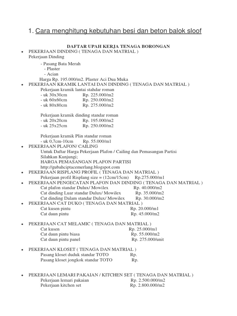 Cara menghitung kebutuhan besi pekerjaan sloof. Untuk 12 buah footplat panjang besi = 12 x 26,53 = 318,36 m. Pada suatu bangunan atau rumah, sloof dipasang secara memanjang diantaraselengkapnyamenghitung volume beton, bekisting, serta besi tulangan untuk sloof Perlu diketahui pada perhitungan kebutuhan besi pada sloof ini, data yang diperlukan berupa denah rencana sloof, jumlah dan diameter maupun jenis besi (polos atau ulir), hingga berat per meter biasanya dengan satuan kg/m diameter besi yang dipakai. Dengan menggunakan contoh gambar denah pondasi dan detail tulangan sloof yang sama, pada tulisan kali ini saya akan menyajikan bagaimana menghitung jumlah besi yang dibutuhkan untuk membuat sengkang (begel) sloof tersebut.